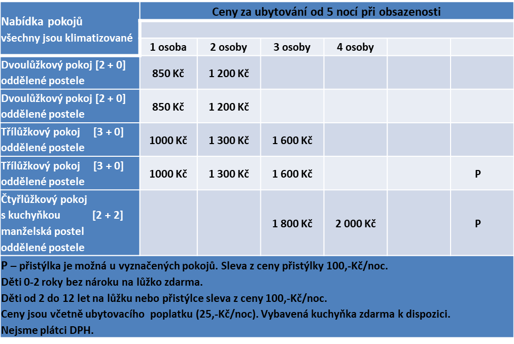 Při pronájmu celého penzionu nad 6 nocí sleva 5%. Další individuální slevy na základě dohody.